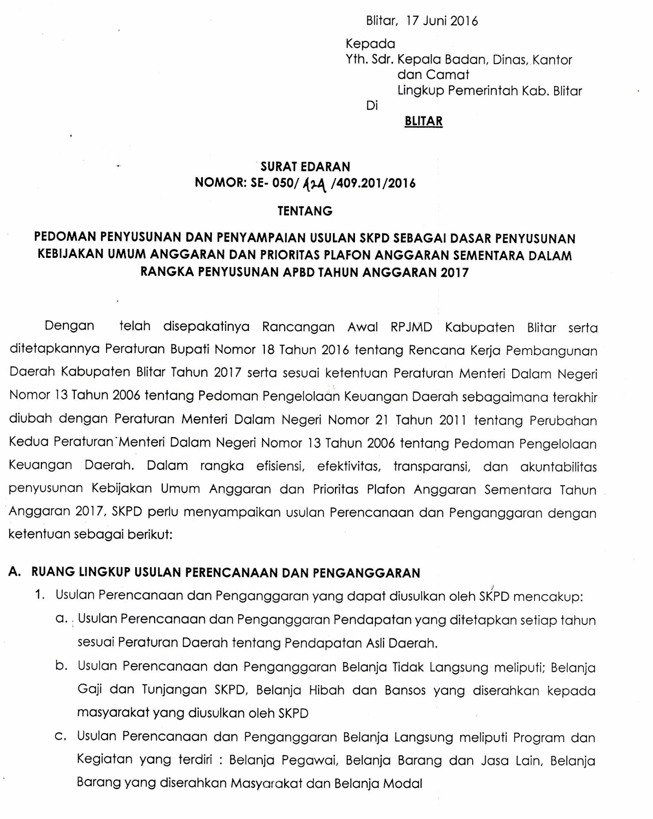 Menindaklanjuti telah Nota Kesepatan Rancangan Awal RPJMD Kabupaten Blitar anatra Bupati dan DPRD serta ditetapkannya Peraturan Bupati Nomor 18 Tahun 2016 tentang Rencana Kerja Pembangunan Daerah Kabupaten Blitar Tahun 2017 serta Sesuai ketentuan Peraturan Menteri Dalam Negeri Nomor 13 Tahun 2006 tentang Pedoman Pengelolaan Keuangan Daerah sebagaimana terakhir diuabah dengan …