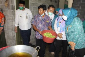 Foto 4 : Ketua TP PKK Kab Blitar beserta Tim Penilai sedang melihat proses pembuatan kripik pare.